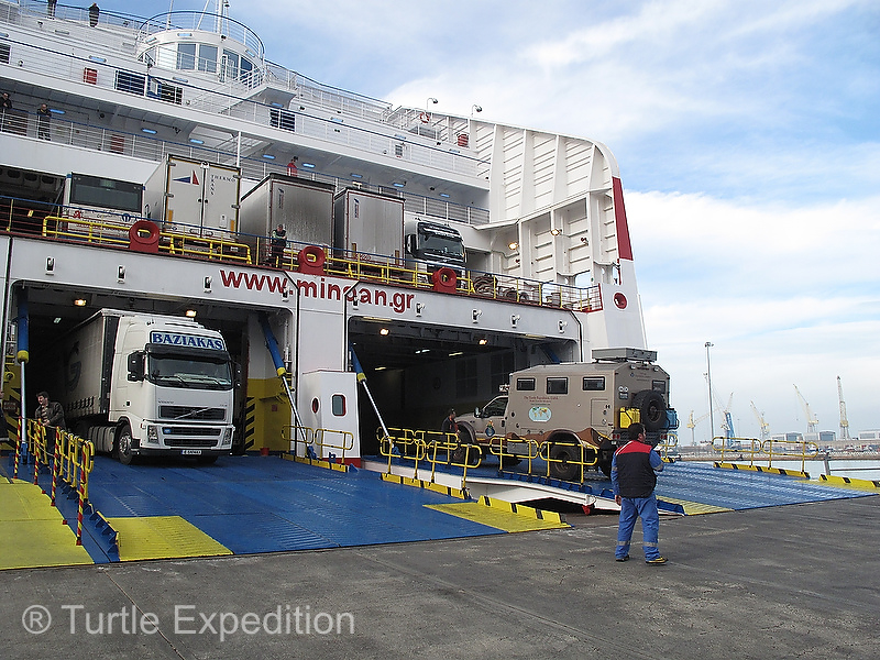 In the morning they were off towards Germany to get their ailing Unimog repaired at the factory and we were staged for loading on the huge ferry that would take us to Patras. It was quite amazing to watch the number of big semi-tractor trailers pour out of the ship’s hold even as they were boarding us. With The Turtle V safely tucked in a corner next to a big tractor-trailer, we grabbed our daypacks and headed up to our little cabin on the 8th level. This was not a luxury cruise, but there were a couple of restaurants, a little casino, a store, a bar, a discotheque, an Internet station and plenty of outdoor decks to walk around.
