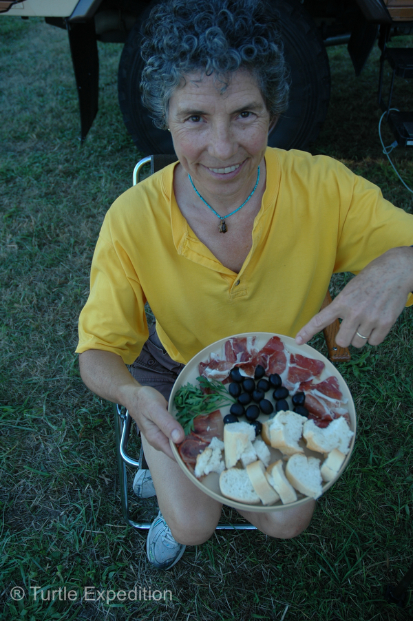 Having just come from the spectacular open market in the city of Santander, we were loaded with fresh fish and shrimp. At a quiet meadow just up the road, we celebrated our first night on the beach with a pile of fresh mussels sautéed in garlic, butter and white wine, with plenty of Spanish bread to sop up the juice. We had also splurged on some of the famous Spanish Serrano ham and some tasty cheeses.