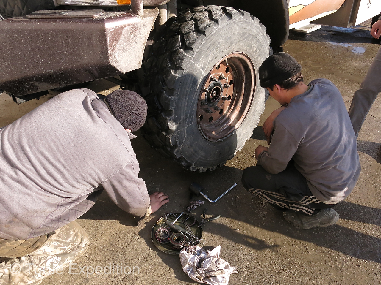 In sub-zero weather we got a sunny day and a second mechanic agreed with me. He knew exactly what he was doing and without even taking the big Michelin XZL tires off, an inspection showed there was still plenty of grease on the bearings but he was able to get a full turn on both outside bearing retaining nuts. Very fortunately, we did have the Dynatrac Free-Spin hub kits that replaced the problematic factory unit-bearings. The Dynatrac Free-Spin hubs use normal Timken bearings and seals and can be serviced anywhere. I did carry a full set of bearings and seals, and I had the big locknut socket needed to remove the outer bearing nuts. The “clunk” was gone!!