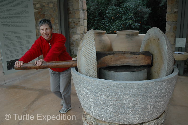 - Monika tries out a replica of an old olive press. Too bad there were no olives available.
