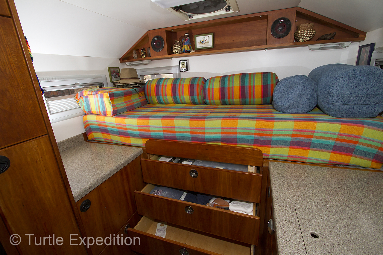 The bed is a 5” medium density mattress with a natural wool cover and fitted sheets. During the day it folds in half and the front base slides into the lower base, creating a comfortable day-bed. At night, it takes 30 seconds to make the full bed, leaving one sink open. All pillows, down comforter, light blanket and down jackets store in stuff bags that also serve as pillows as needed.