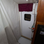 Bathing and going to the bathroom are both very important elements of a practical comfortable camper for long-term travel overland in undeveloped countries, or anywhere else for that matter. Where do you put a 3ft X 3ft X 6.5ft space in a small camper, just for occasional use? The Germans figured this out too. Use the doorway! It is a space that is always there. We designed a sunken entry that drains into a separate 12-gallon holding tank. (Great for washing muddy shoes) A light coated ripstop nylon shower curtain encloses the exposed interior part of the entry and gives us a relatively large shower with plenty of elbow room. It is much bigger than the 19in X 27in entry pad which has plenty of room for our feet and room to move around. Shower head and controls are in an entry wall compartment. The wet ripstop curtain dries in a few minutes.
