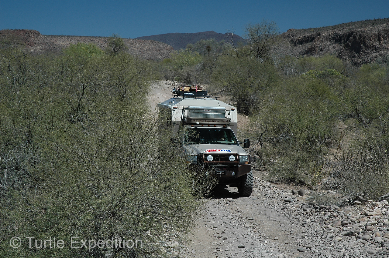 Getting a lazy start the next morning, we lowered our big Michelin XZLs down to 30psi and headed west on what started out as a very nice sandy track leading to the Pacific Coast some 50 miles away. The unnamed backroad is sometimes used as part of the Baja 1000 off-road race and it is seldom if ever maintained. This was supposed to be a “shake down” trip for The Turtle V before we ship to South America, and shake it did. There were some very rocky pot-holed sections and some 4-inch washboard that required slow speeds. The real function of trails like this are not to entertain four-wheelers or the wanna-be racers. Their purpose is to reach the fishing, lobster, abalone, crab camps and remote cattle ranches. While you might think you are “off-roading”, your hubs locked and 4X4 engaged, you are likely to meet a fisherman in a two-wheel drive pickup with bald tires bringing his catch to the market. He will be just as surprised as you!