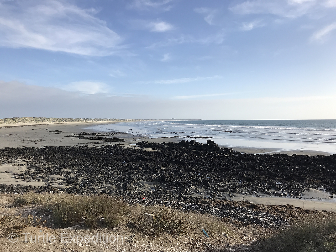 Finally it felt safe. The soft sand getting to the hard pack of the receding tide definitely asked for four-wheel-drive but then it was damp sand at 35 mph to the exit of the beach. More soft sand that can be driven in two-wheel-drive if you aren’t as heavy we are. After a scenic drive through volcanic rolling hills and sand dunes, we arrived at our old friend’s home, Antonio Jimenez, and another perfect campsite. Here, the sandy road ends and turns abruptly down a long flat beach along the Punta Mazo peninsula. It is this beach where many big Pismo type clams are harvested. At low tide we could drive all the way to the far distant point.
