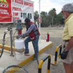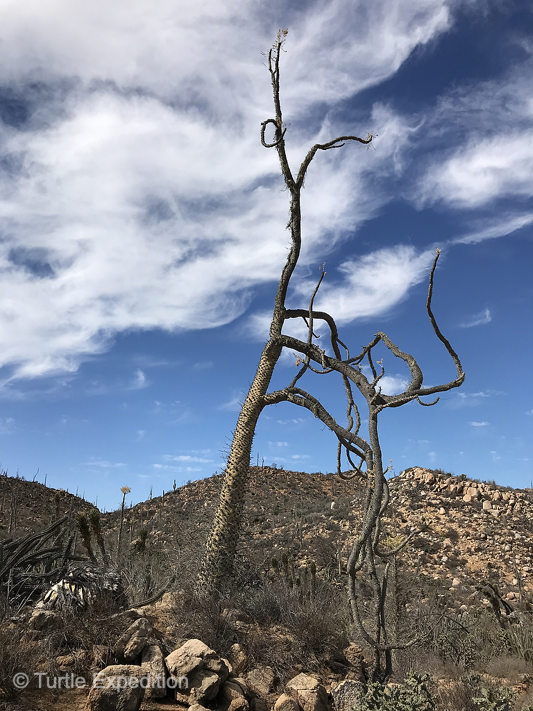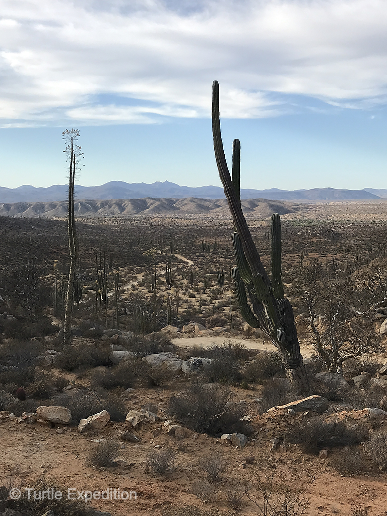 The road back out to Hwy 1 was as rough as we had ever seen it, perhaps the result of recent hurricanes, the last Baja 1000 race, or the swarms of side-by-side Razors that have ruined many of our favorite backroads as they follow apps that are telling everyone where to go. After a pleasant night at Turtle Camp we continued a few miles south. The gas station in the town of Cataviña was abandoned but our 1,000-range would take us all the way to Santa Rosalia or Mulegé if needed.