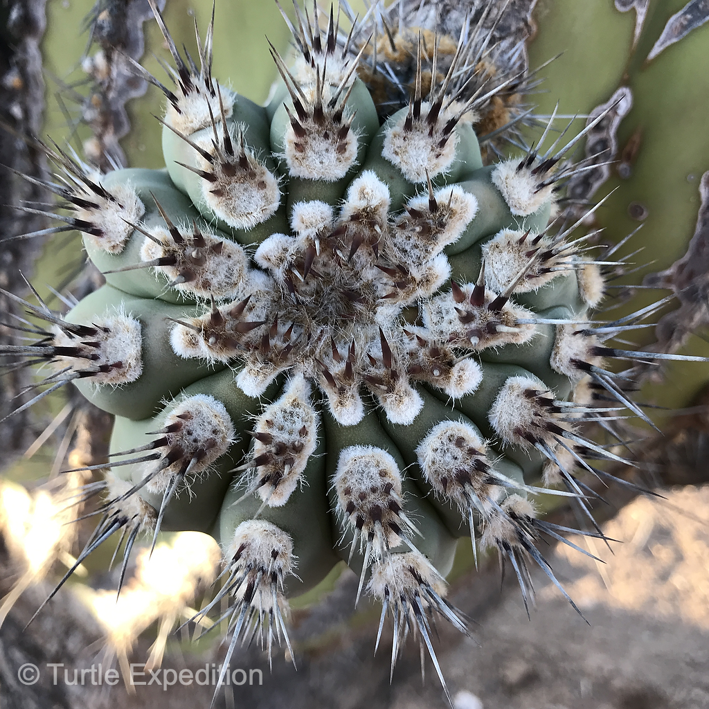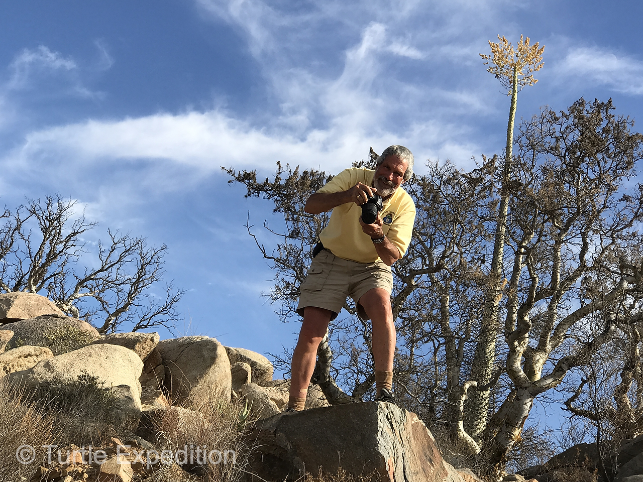 The scenery was spectacular from valley to valley, ranging from forests of crazy Boojum Trees (Cirios) to stately Giant Cardón, Coastal Agave, Jumping Cholla, Elephant Trees (Torote Colorado), Old Man Cactus, and clusters of spiky Barrel Cacti. Sometimes we just had to stop and climb a rock to take in the view. Traffic was nil so camping at dusk was simply finding a clearing and stopping. Safety was not even a remote concern. We still had plenty of fish and a stash of fresh oysters. There is something special about camping 30 or 40 miles away from the nearest highway or light bulb. We even found a place where the local families had built a little shelter with some tables.