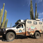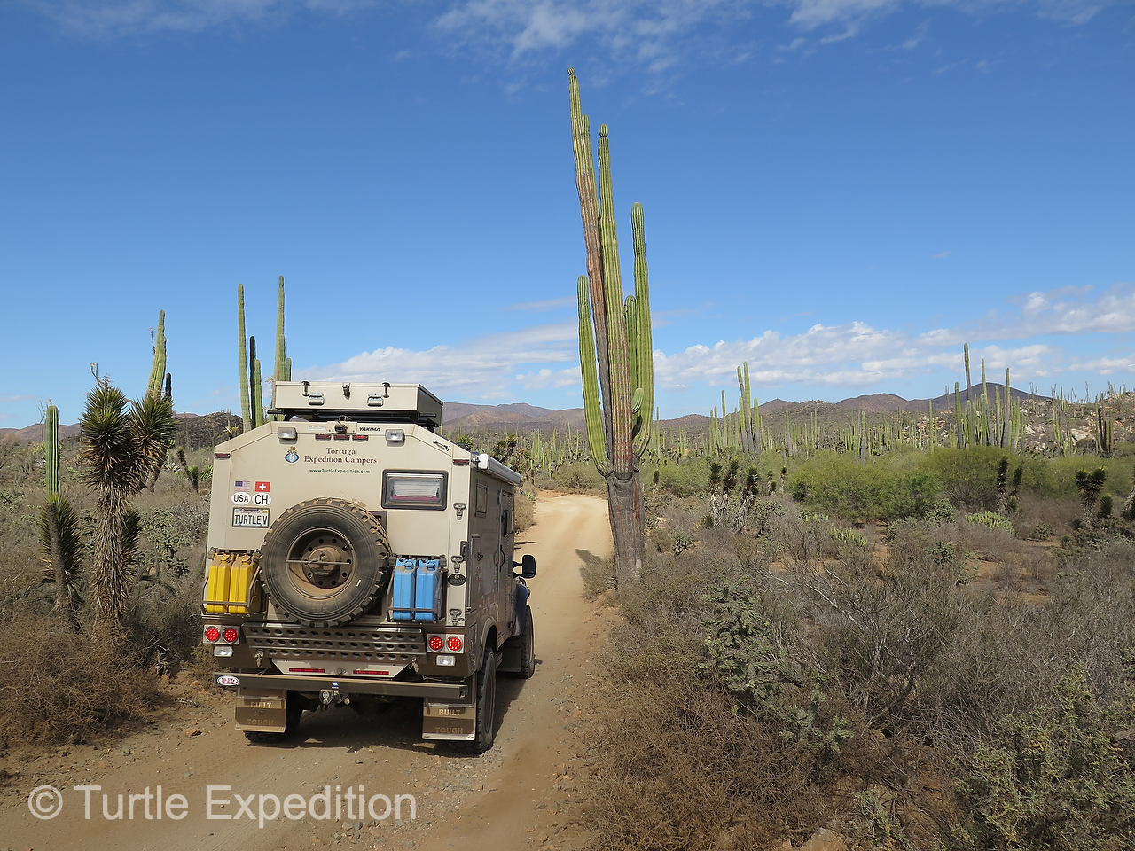 The camp overlooking the 8-kilometer-long clam beach and the Punta Mazo Peninsula was too perfect not to stay a couple of days, but we did need to move on, and we had to time our exit for a low tide to return to the gravel road and Highway 1. After airing up the tires back to 55psi and a few quick stops in San Quintin to fill up on diesel, water and some fresh fruit, we drove south down the Baja Peninsula. The narrow road was sometimes treacherous, with big semi-trucks passing us only inches away at combined speeds of 120 miles an hour. Often there was no shoulder, or worse, a 6” drop-off over a steep berm. No room for mistakes. To make an already obvious point, we stopped to take a few photos of what I guessed was about a $230,000 Unicat MAN expedition camper parked in one of the numerous junkyards along the highway. I had recognized the style of windows from a visit to the Unicat factory in Germany years ago when we were researching our own Turtle V. An overturned semi loaded with tomatoes offered more evidence. Little crosses along the road reminded us of those who were less fortunate.